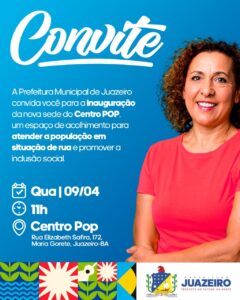 Avançando em conquistas para a população de Juazeiro, a Secretaria de Desenvolvimento Social, Diversidade, Igualdade Racial e Combate à Fome anuncia a inauguração da unidade do Centro de Referência Especializado para População em Situação de Rua (Centro POP). O evento será realizado na próxima quarta-feira (9), às 11h, na Rua Elizabeth Safira, 172, no bairro Maria Gorete.