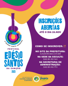 Continuam abertas até o dia 26 de novembro as inscrições para a 25ª Edição do Festival Edésio Santos da Canção de Juazeiro. O evento é uma realização da Prefeitura de Juazeiro, através da Secretaria de Cultura, Turismo e Esporte (Seculte).