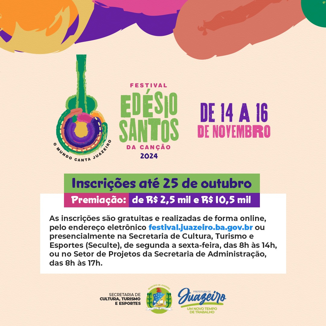 As inscrições são gratuitas e realizadas de forma online, pelo endereço eletrônico festival.juazeiro.ba.gov.br ou presencialmente na Secretaria de Cultura, Turismo e Esportes (Seculte), de segunda a sexta-feira, das 8h às 14h, ou no Setor de Projetos da Secretaria de Administração, das 8h às 17h.