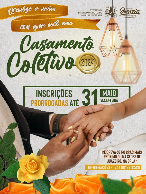 A Prefeitura de Juazeiro, através da Secretaria de Desenvolvimento Social, Mulher e Diversidade (Sedes), prorrogou as inscrições para o Casamento Coletivo 2024 até sexta-feira (31). As inscrições são gratuitas e a iniciativa é aberta aos casais que desejam oficializar a sua união.