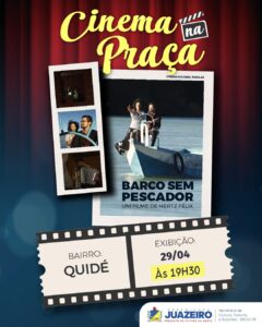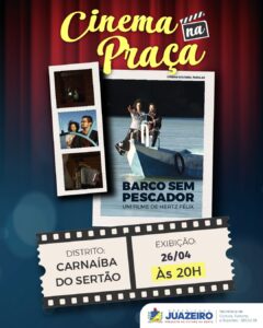 O “Cinema na Praça”, projeto que leva sessões itinerantes de cinema para a comunidade, vai realizar novas exibições em Juazeiro. O projeto chega ao distrito de Carnaíba do Sertão neste sábado (26) e retorna ao bairro Quidé na terça-feira (29). Ambas as sessões estão programadas para as 19h e acontecem, respectivamente, na Praça Central e na Praça da Feira das localidades.
